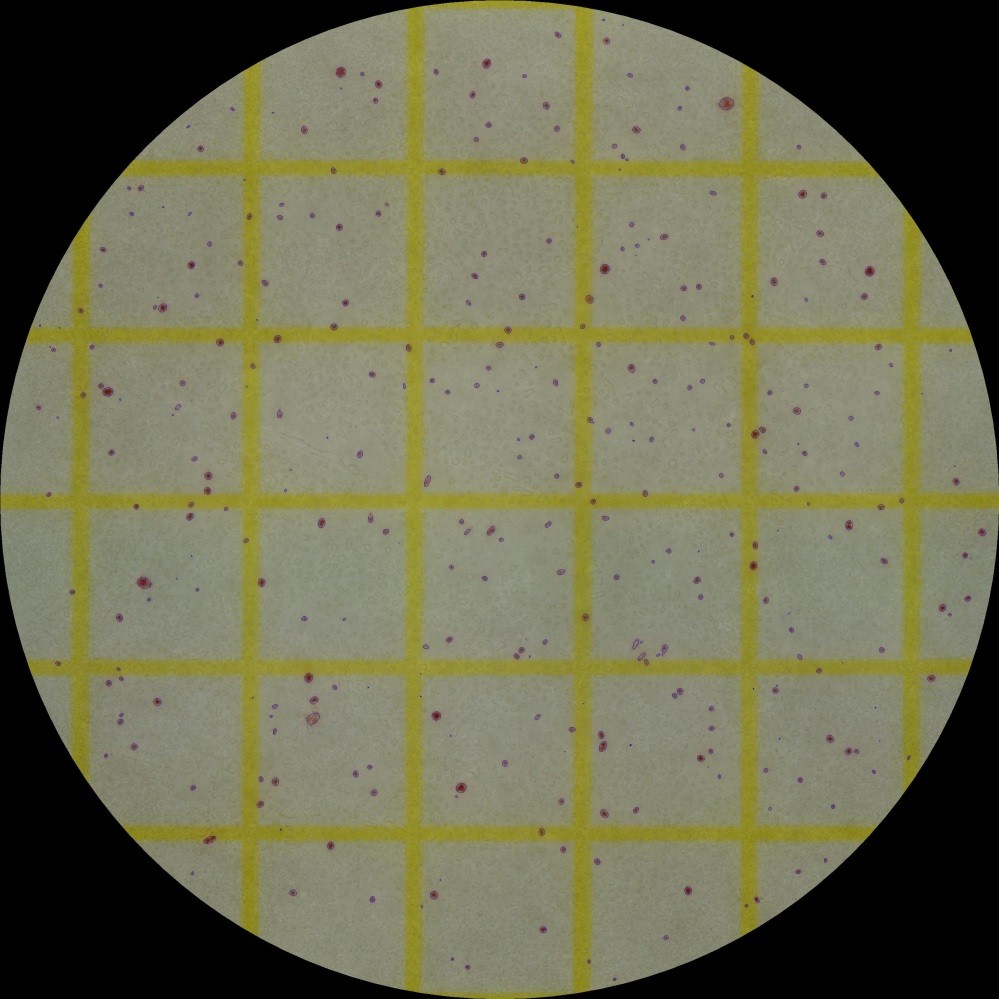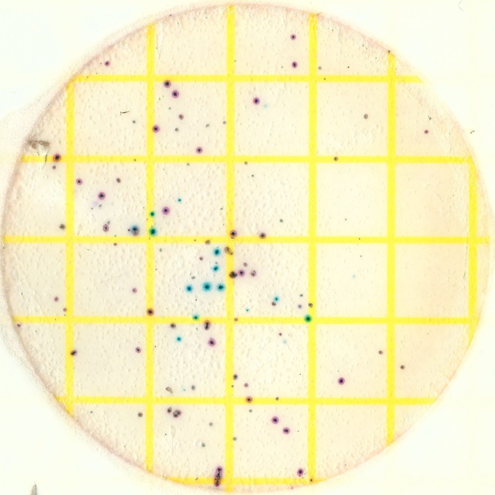 無痕剔除網格及文字技術在HiCC-D 型2平皿全自動菌落計數分析儀也體現得非常完美。3M紙培養基或濾膜上存在的網格線,沒影響對菌落的自動計數,其自動計數標記詳見下圖: