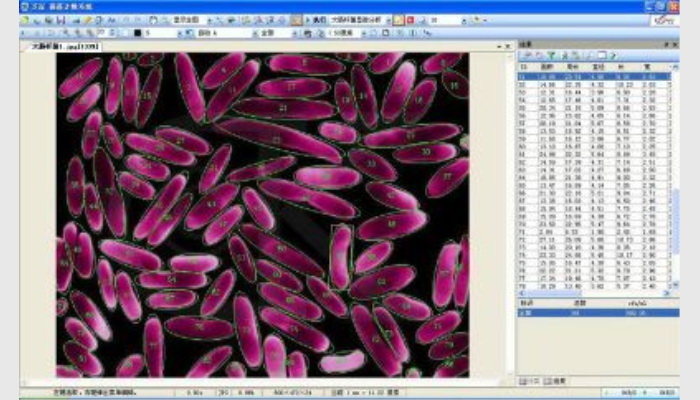 (5)★自動分割成片粘連的長形或圓形目標,自動分類計數(shù)與測量(獲得面積、周長、直徑、主軸、副軸等形態(tài)參數(shù))。