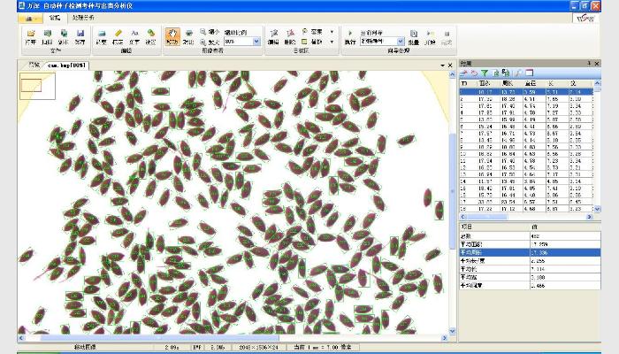 5、★能自動測出各類粘連種粒的每粒粒形參數(長、寬、長寬比、面積、等效直徑、周長等),能精準顯示種粒外接矩形,并可自動排序輸出,及可輸出粒徑分布圖表。